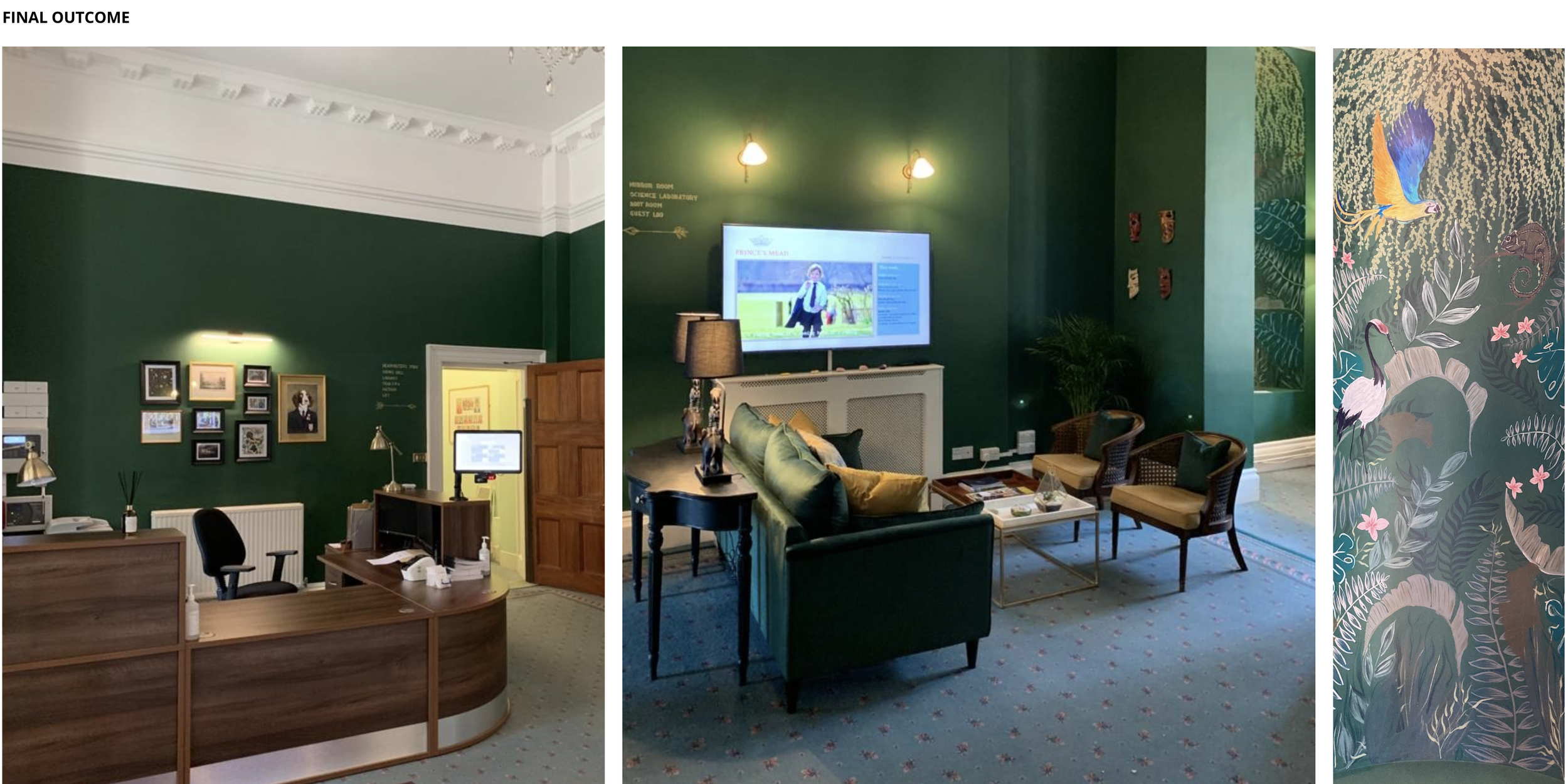 The transformation successfully redefined the space from a clinical, uninviting environment to one that is warm, engaging, and memorable. The design carefully balanced the building’s listed Georgian character with a more playful, imaginative approach, allowing original architectural features to become focal points rather than overlooked elements. Second hand furniture was sourced including reception desk and other items to manage budget wisely. Sustainable lime based paint was used by Graphenstone, which neutralises the air to encourage a healthier environment. It now feels open, friendly, and family-oriented welcoming both children and adults into a space that immediately communicates care, creativity, and belonging. Inspired by the sense of wonder and curated storytelling found in cultural and heritage environments, the design introduces moments of discovery and visual interest that spark curiosity from the moment of arrival.