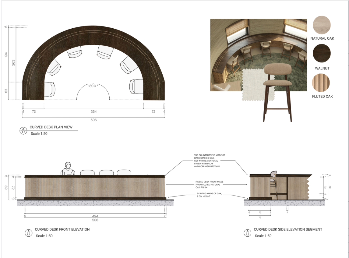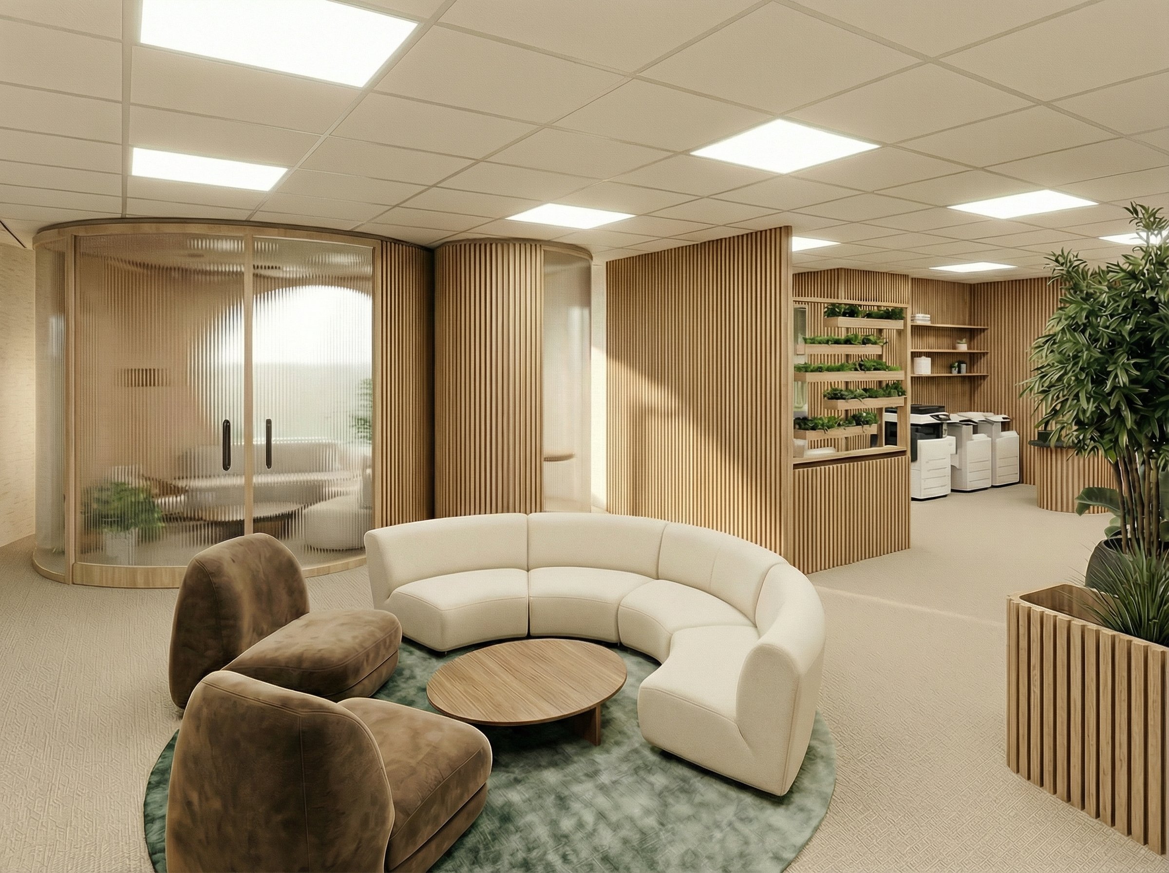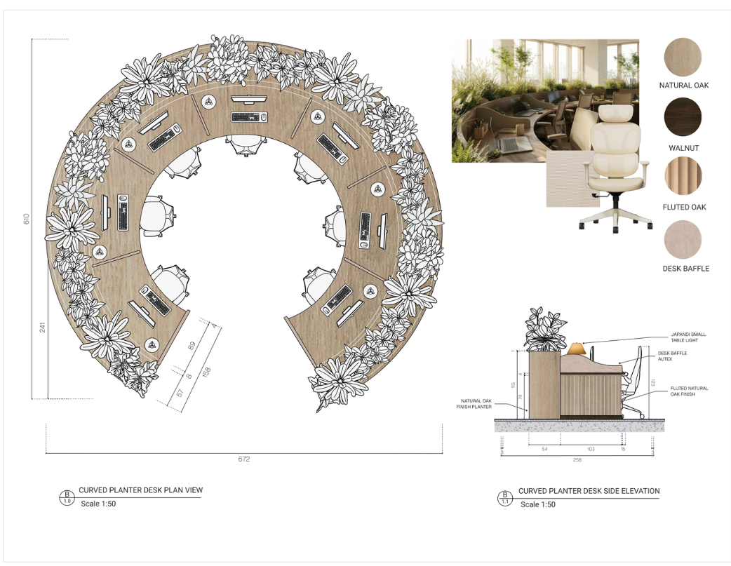 This project explores the design of a commercial workspace environment as part of my Masters in interior Design, investigating sustainable, wellbeing-centred interior architecture and design environments. it was important to understand how this workplace could better support the psychological, emotional, and functional needs of the client’s organisation while aligning with sustainable design principles and the consideration of the teams needs.
